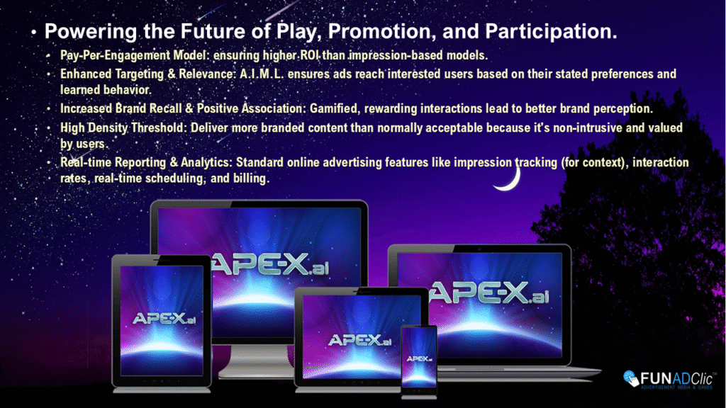 Through use of our patented AI enhanced interactive Ad Tech, Ape-X delivers a reward driven, non-interuptive, real-time, direct targeted advertising content tailored to each Users individual needs, wants and desires. In essence, – “The Gamification of Advertising!”